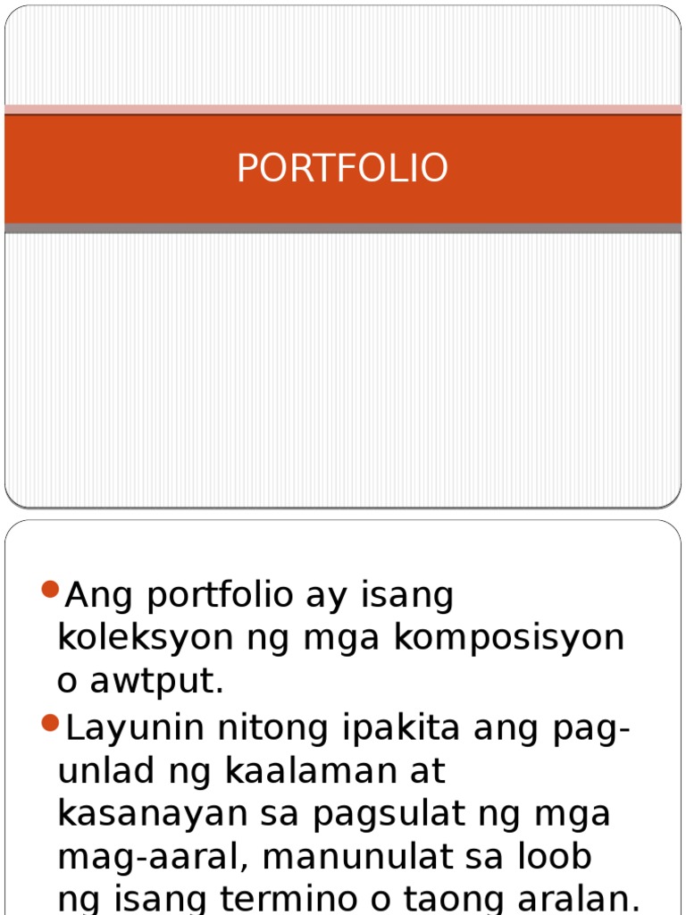 Ang pangunahing layunin ng paggawa ng isang portfolio ay ang pagkakaroon ng isang organisado at protektadong bulto ng mga dokumento. Aileen Galang Shiela Pardilla Jerald Tayag Jared Mark Fruelda Khen Eiron Miranda Panimula Nilalaman ng portfolio na ito ang koleksyon ng mga pang-akademikong sulatin na aming nilikha mula sa asignaturang Filipino. Wala lang share ko lang.